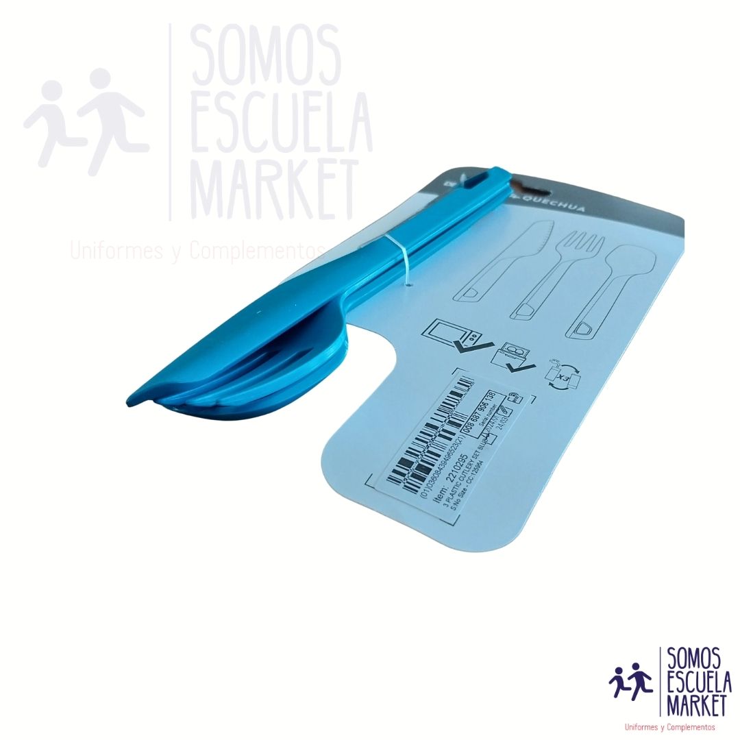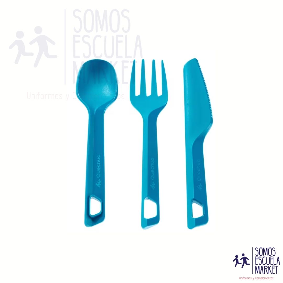 Tres cubiertos (cuchillo, tenedor, cuchara) de plástico muy ligeros y resistentes (poliamida) que se pueden fijar entre sí.